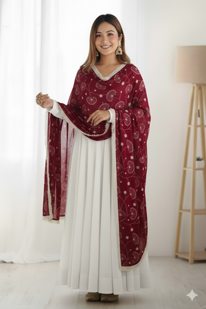 Elegant White Georgette Anarkali Gown with Maroon Sequins & Zari Lace Dupatta