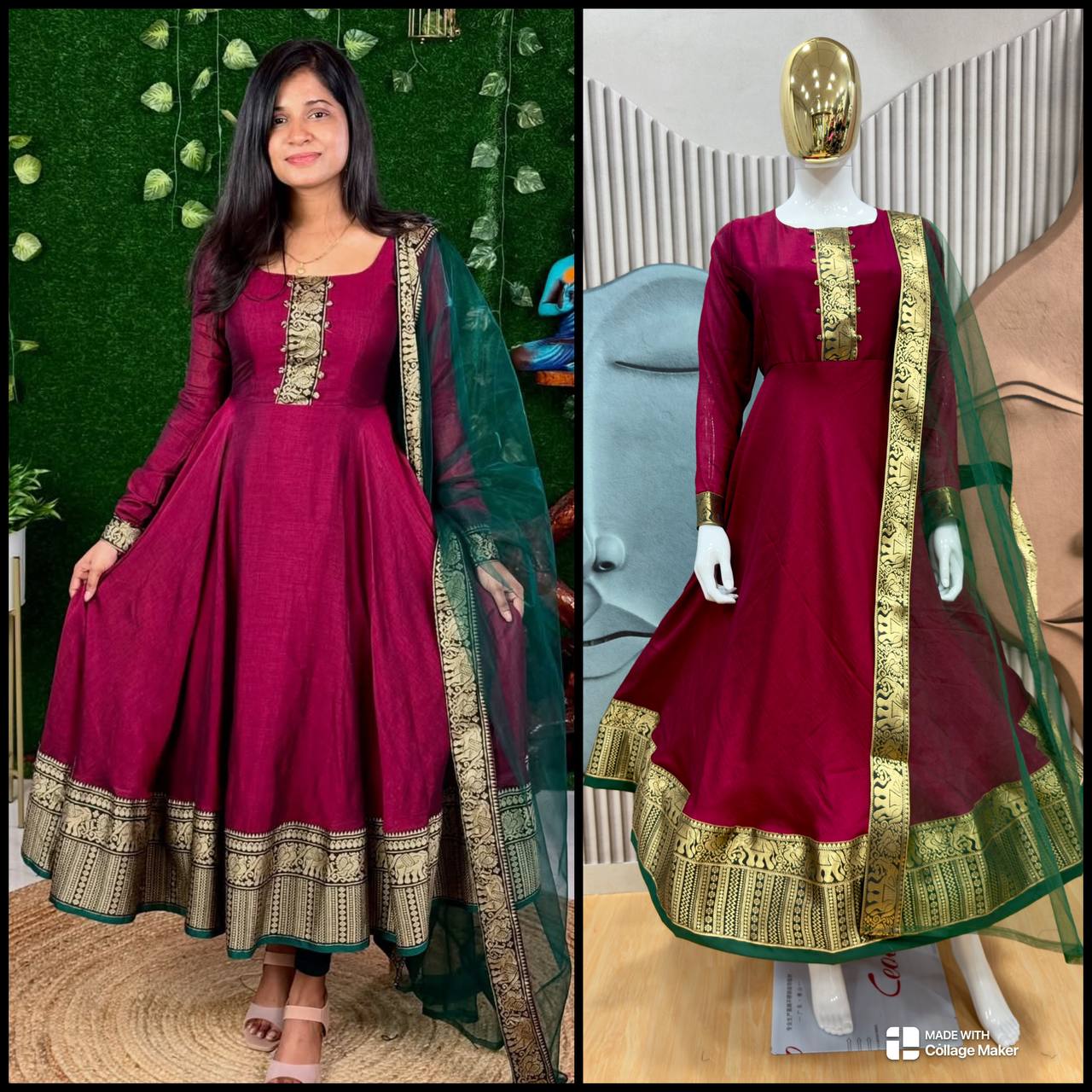 Fabric (Gown): Heavy blooming Vichitra silk for a rich and elegant look