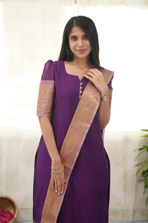Graceful Violet South Cotton Kurti with Golden Border – A Stunning Ethnic Look for Any Event